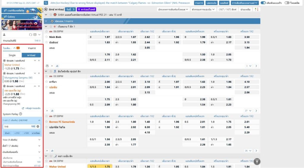 - เลือก 3 คู่ รวมค่าน้ำ 6.54 → ลงทุน 100 บาท = จะได้ 654 บาท รวมทุน